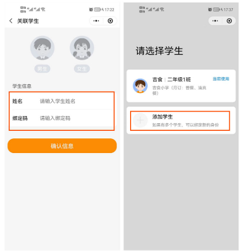 進入小(xiǎo)程序微信授權,關聯“學生(shēng)信息”,選擇學生(shēng)性别,填寫姓名、綁定碼添加學生(shēng)。一名家(jiā)長可(kě)以添加多(duō)名學生(shēng)。