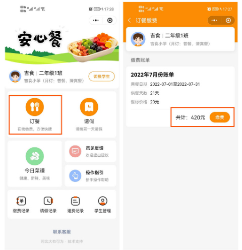添加好學生(shēng)信息後并選擇學生(shēng)進入,還(hái)可(kě)在該頁面切換學生(shēng),點擊訂餐進入訂餐繳費頁面,直接繳費。