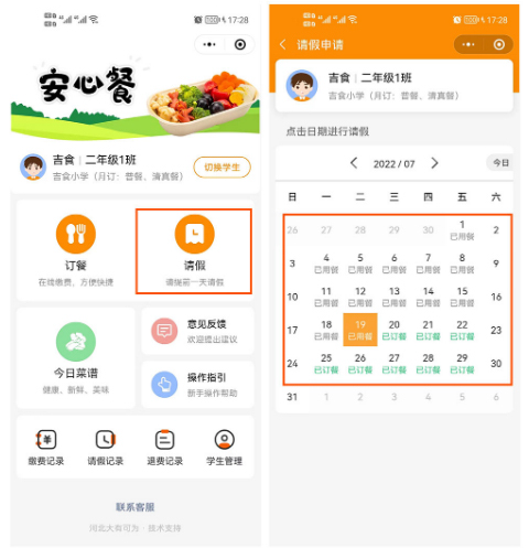 點擊“請(qǐng)假”,進入請(qǐng)假頁面,點擊已訂餐日期進行(xíng)請(qǐng)假;點擊已請(qǐng)假日期進行(xíng)取消請(qǐng)假。